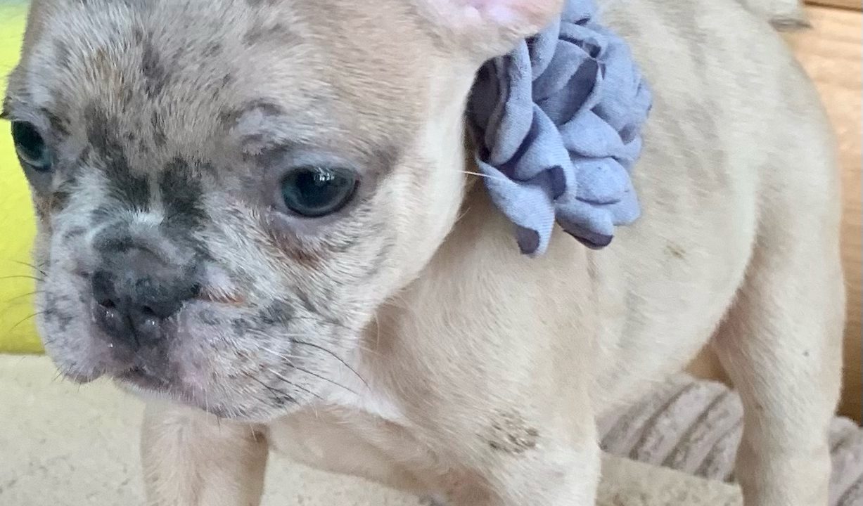 Hi, I’m Vanilla a merle female French Bulldog! Look at how cute my little face is. Right now I spend my days napping the day away and eating as much as I can. My daddy is Tattoo, a lilac merle with tan points son of Lord Sugar. Momma is a beautiful blue Azule. I cannot wait to join my furever family.